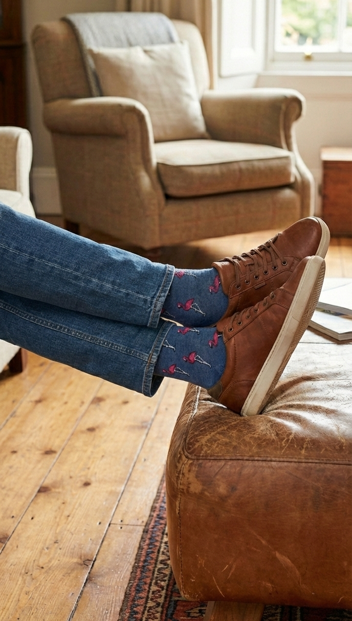 Pisa con elegancia y un toque de audacia. Nuestros calcetines de flamencos son la elección perfecta para quienes buscan frescura y originalidad sin renunciar a la calidad. Sobre un fondo azul denim que combina con todo, el patrón de flamencos aporta una personalidad inigualable a tu look.