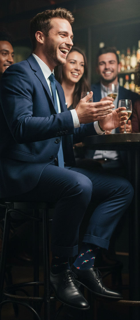 Dale un toque de color y distinción a tu día a día con nuestros calcetines de loros. El modelo Vuelo Real combina la elegancia clásica del azul marino con un patrón exótico y vibrante, diseñado para quienes no quieren pasar desapercibidos pero mantienen siempre un estilo impecable.