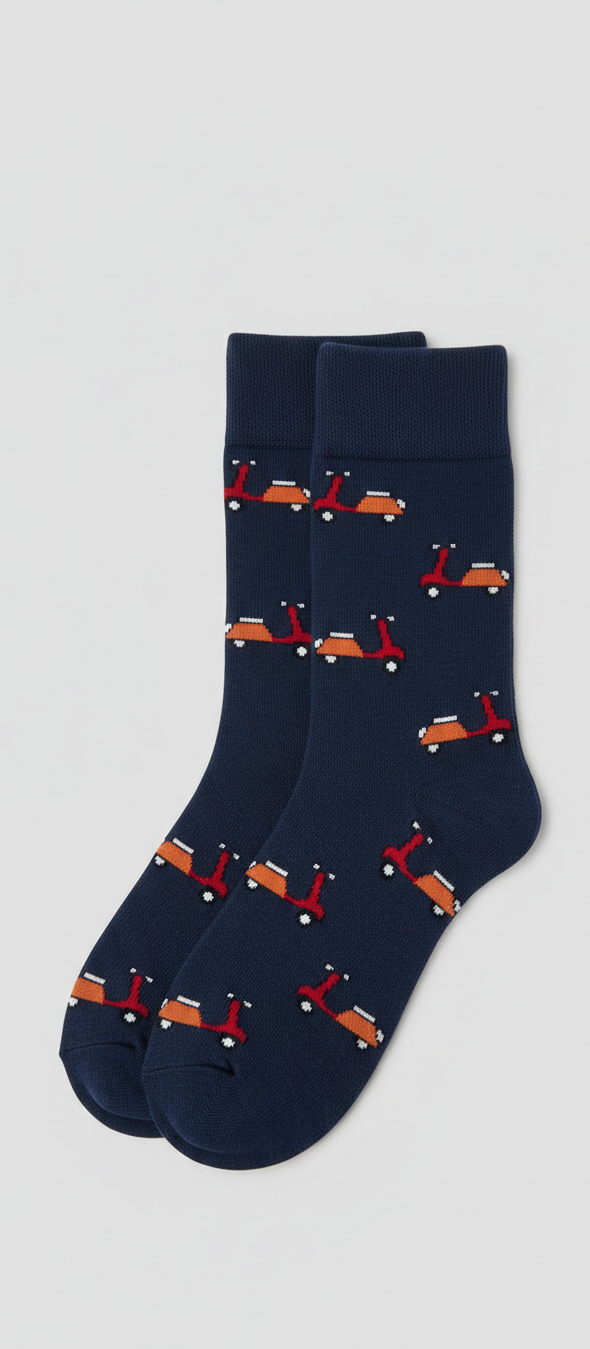 Diseño Icónico: Estampado de motos tipo scooter en contraste sobre un azul profundo, ideal para un look casual pero con mucha personalidad.