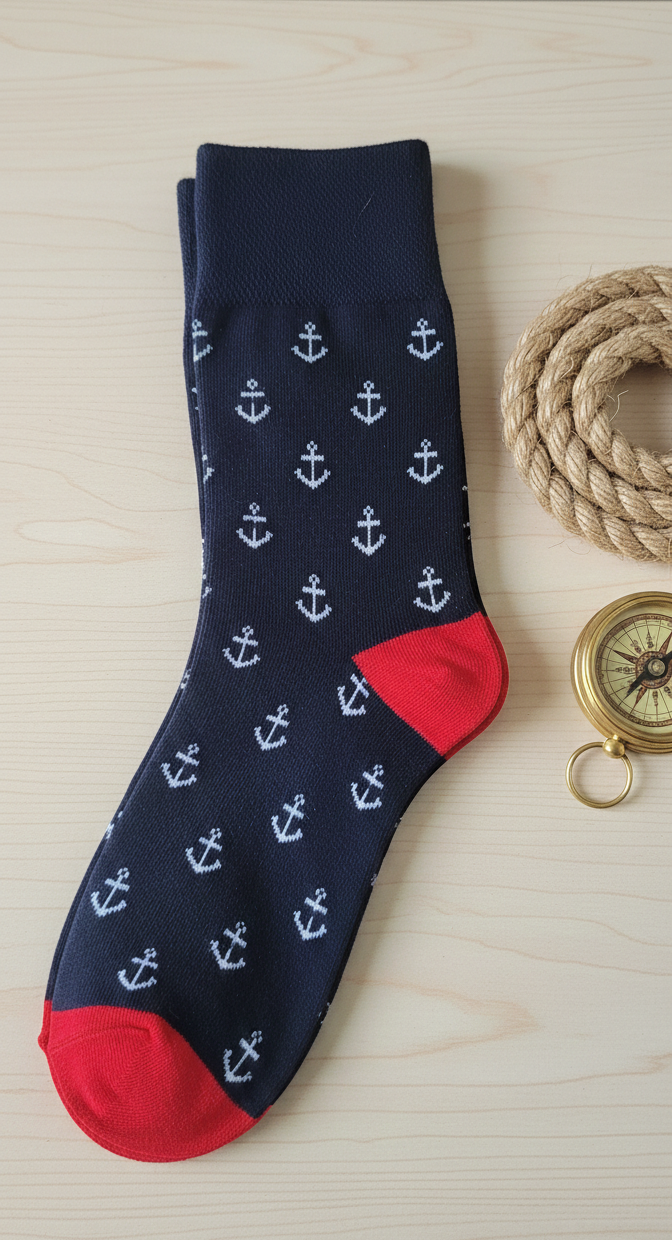 Un patriota se viste por los pies. Para los que llevan el espíritu marinero en el ADN y no renuncian a la elegancia clásica, llegan nuestros calcetines náuticos. Un diseño atemporal en azul marino con anclas blancas y el toque distintivo del talón y la puntera en rojo pasión.