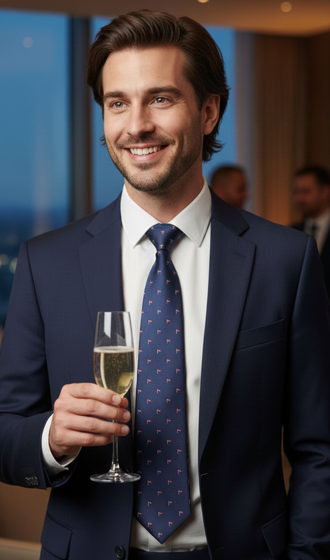 Una pieza de distinción y artesanía. Presentamos nuestra exclusiva corbata azul marino, meticulosamente hecha a mano con la más fina seda natural 100%. Este diseño único incorpora un elegante patrón de banderines (o banderas), fusionando la sofisticación atemporal con un toque de orgullo patriótico o inspiración náutica.